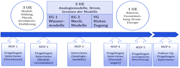 Oberhalb der Zeitleiste ist der Unterricht, unterhalb sind die Messungen dargestellt. Es kommen Fragebögen und Interviews zum Einsatz.
